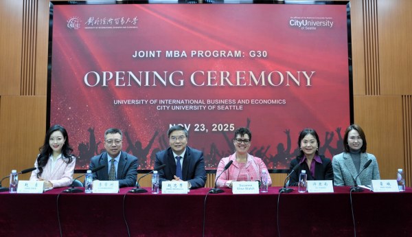2025年11月23日,我校与美国西雅图城市大学合作举办的工商管理硕士教育项目第三十期班开学典礼在高远楼118报告厅圆满举行。对外经济贸易大学校长赵忠秀、美国西雅图城市大学校长Suzanne Elise Walsh出席典礼。继续教育学院(高级研修学院)院长李常州、国际合作交流处副处长霍媛、继续教育学院(高级研修学院)副书记赵贞、美国西雅图城市大学助理教务长许亚南、西雅图项目部工作人员以及全体新生与会。开学典礼由赵贞主持。