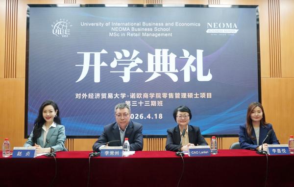 2026年4月18日,对外经济贸易大学与法国诺欧商学院联合举办的零售管理硕士项目2026年春季班开学典礼圆满举行。法国诺欧商学院零售管理项目学术主任CAO Lanlan教授、继续教育学院(高级研修学院)院长李常州、副书记赵贞、项目中方主任李嘉悦出席典礼,与全体新生共同开启全新学习征程。典礼由学院副书记赵贞主持。